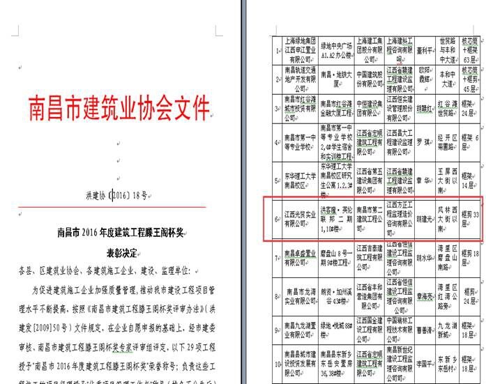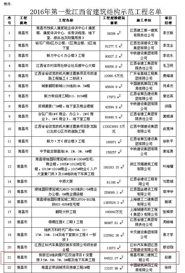 由南昌市第二建筑工程公司承建的郭家莊B地塊棚戶(hù)區改造項目(安置房)5#、6#、7#、8#樓及地下車(chē)庫工程獲“2016年第一批江西省建筑結構示范工程” [摘自贛建質(zhì)監字[2016]1號]。