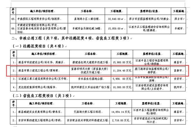 由南昌市第二建筑工程公司承建的江西旺旺新建廠(chǎng)房1#車(chē)間工程獲“2015年度江西省優(yōu)良工程獎”,宜春市明月大橋(原宜春大橋)改建及引道工程榮獲“2015年度江西省杜鵑花獎”[摘自江西省住房和城鄉建設廳文件贛建質(zhì)字[2016]5號]。